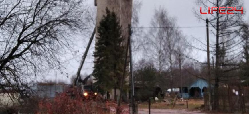 Ранее металлический резервуар вверху башни был демонтирован полностью. Сегодня рабочие обкопали башню. Обвязали ее цепями и с помощью грузовика попытались уронить. Однако эта попытка не удалась. Тем временем между домами №17 и №19 на улице Цветочная стали собираться местные жители, чтобы посмотреть, как будет падать башня.
