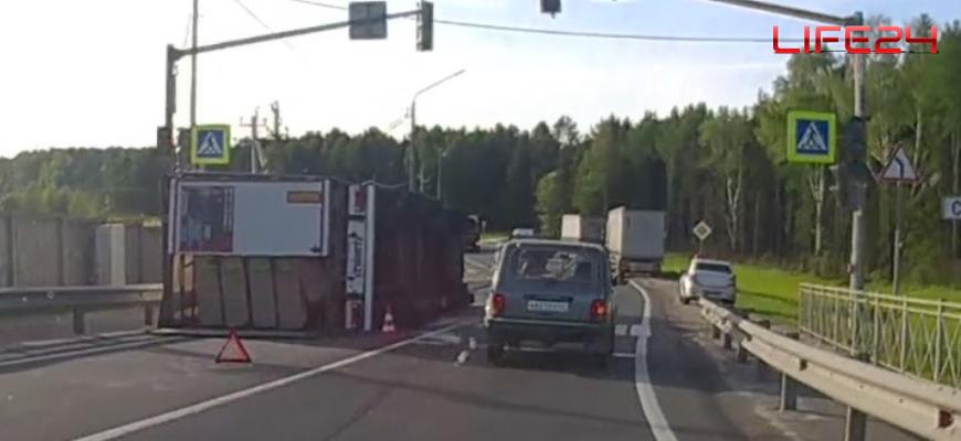 Водитель груженной фуры, предварительно, не справился с управлением, что привело к ее опрокидыванию на встречную полосу и частичному блокированию пешеходного перехода.