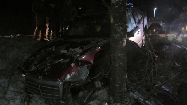 В результате столкновения автомобиль Мерседес совершил съезд в левый придорожный