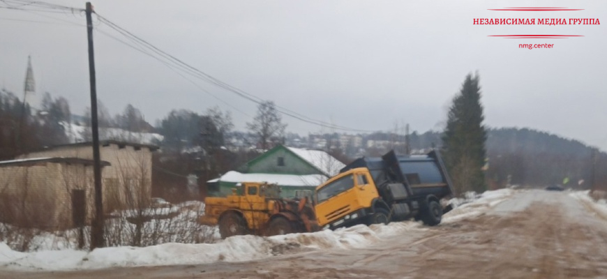 На место происшествия оперативно прибыл трактор К-700 «Кировец», который оказывает помощь в извлечении мусоровоза.